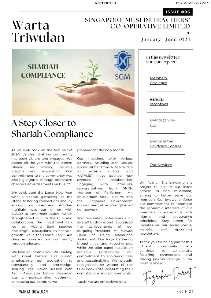 Our services includes Savings and Financings and we are working hard to align them with Shariah principles. We also have two (2) childcare centres to ensure that we groom our children to be future leaders of Singapore.